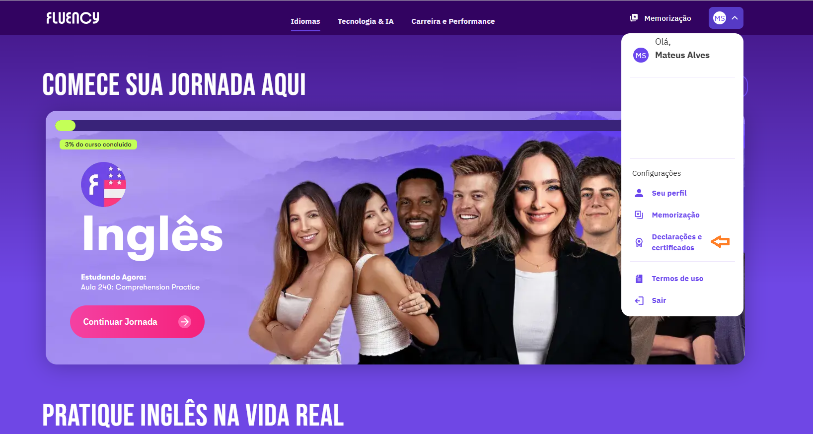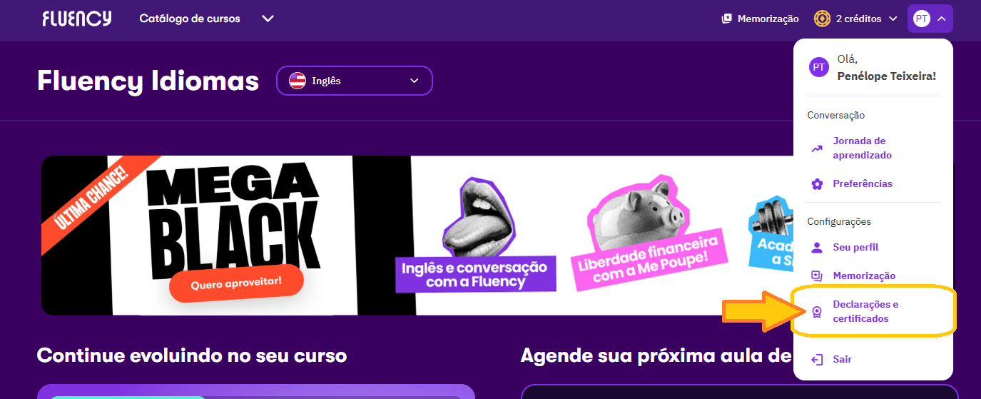 2️⃣ Dentro das suas compras, você vai se deparar com todas as suas aquisições, incluindo os cursos da Fluency;