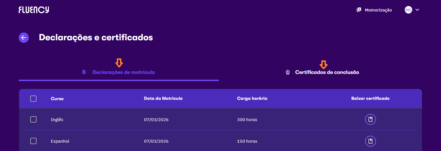 Dentro da página, basta selecionar se você quer baixar certificados ou declaração de matrícula, como mostra a imagem abaixo, e prontinho. ✅